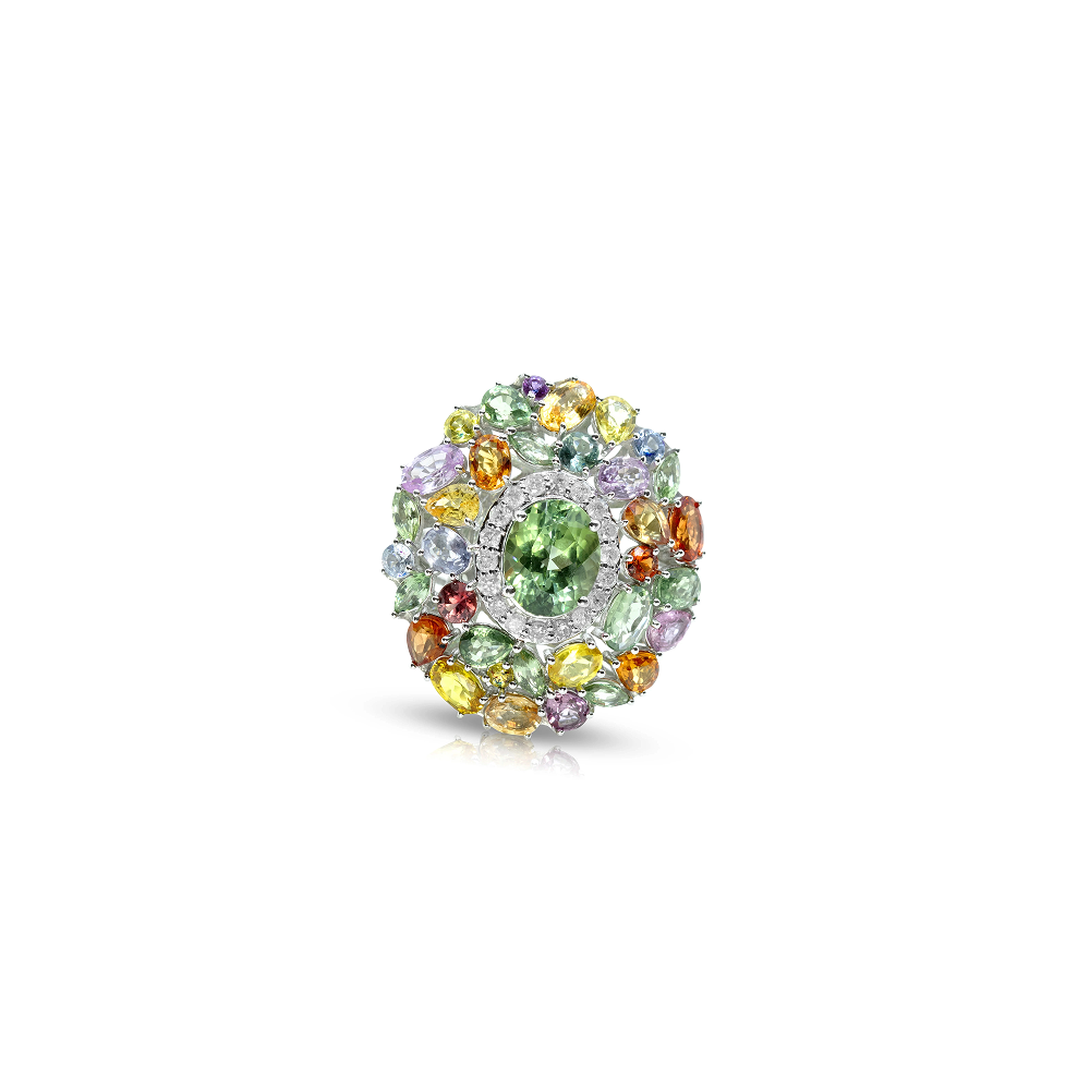 Design: A vibrant display of color and sparkle. This 18ct yellow gold ring features a vivid green oval tourmaline at its center, surrounded by shimmering round diamonds, synthetic multi-colored stones, and pear, marquise, and ovalcut sapphires. The sculptural cluster design creates a bold, statement look perfect for special occasions.