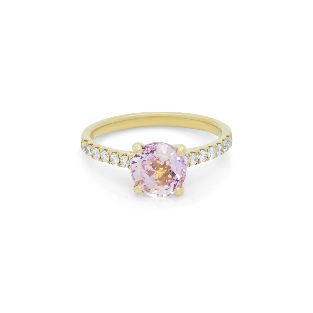 Design: A captivating 18ct yellow gold ring showcasing a luminous morganite centre stone, accentuated by natural round brilliant-cut diamonds that enhance its warm blush tones. Elegant and feminine, this piece radiates timeless sophistication and charm.