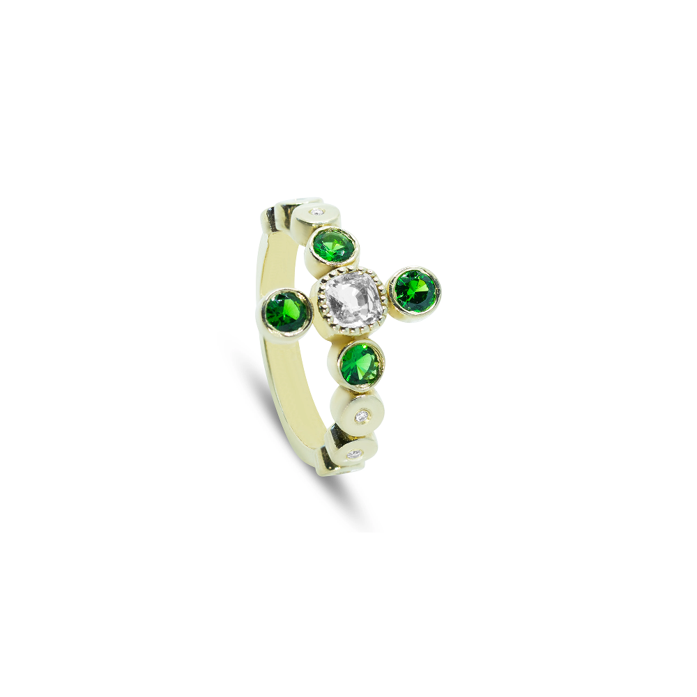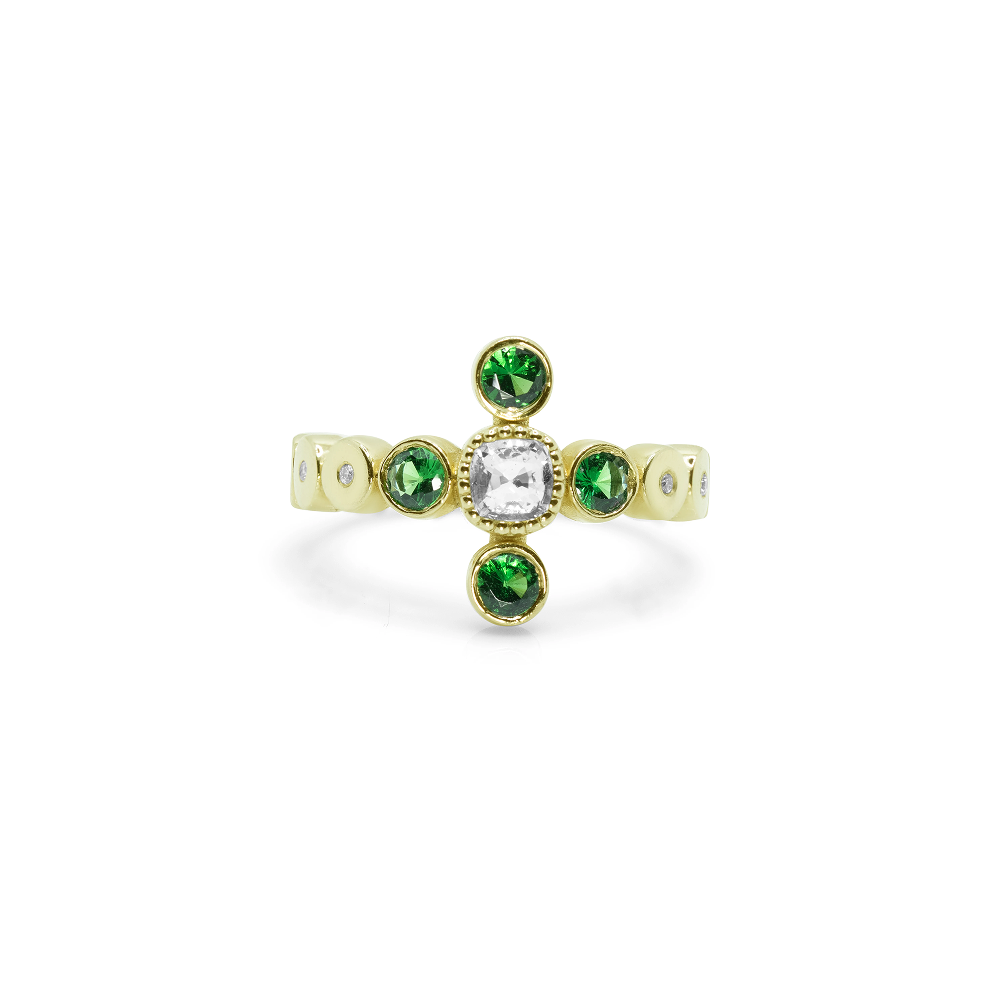 Design: A vibrant 18ct white gold ring featuring a 0.5ct natural white sapphire, accented by four brilliant tsavorite stones totaling 0.8ct and enhanced with natural diamonds. The harmonious blend of green and white stones creates a playful yet elegant design perfect for everyday luxury or special occasions.